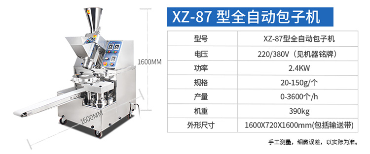 XZ-86型全自動(dòng)包子機(jī),可生產(chǎn)各種肉包、菜包、肉菜包、小籠包、湯包、水晶包、圓饅頭、奶黃包、豆沙包、叉燒包、南瓜餅、煎堆等十幾種包餡制品。適用于賓館、飯店、學(xué)校、機(jī)關(guān)企業(yè)食堂、饅頭或包子加工廠、早餐工程店及速凍食品廠等單位??蓾M足不同客戶群體。免費(fèi)提供工藝技術(shù)。免費(fèi)上門培訓(xùn)指導(dǎo)安裝。