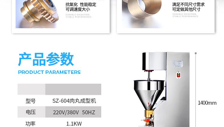 SZ-604肉丸成型機(jī),肉丸成型機(jī)采用不銹鋼材質(zhì),丸子直徑可達(dá)15-35mm,可以制作各類爽脆,有韌性、有彈性的豬肉丸、魚丸、牛肉丸、貢丸、雞肉丸等