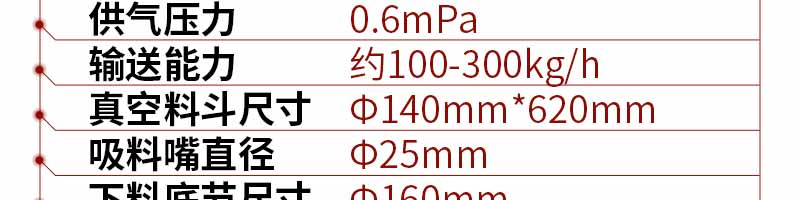 當壓縮空氣供給真空發(fā)生器時,真空發(fā)生器就產(chǎn)生負壓形成真空氣流,物料被吸入吸料咀,形成物氣流,經(jīng)過吸料管到達上料機的料倉內(nèi)。過濾器把物料與空氣分離,當物料裝滿料倉時,控制器會自動切斷氣源,真空發(fā)生器停止工作,同時料倉門自動開啟,物料落到設備的料斗中。與此同時,壓縮空氣通過脈沖反吹閥自動清洗過濾器。等到時間到或料位傳感器發(fā)出上料信號時,自動啟動上料機。