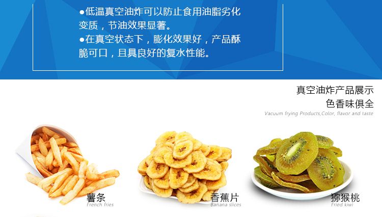 ●真空油炸是在低溫(80~120℃)對食品進行油炸、脫水,可以有效地減少高溫對食品營養(yǎng)成分的破壞。
