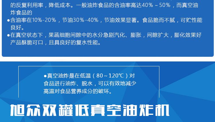 ●雙室采用上下兩個罐,脫油時確保絕對無回油,使含油、含水率低。油炸、脫油、脫水、油過濾一體化設(shè)計,在真空下連續(xù)性完成,產(chǎn)品含油量低,產(chǎn)品處于負壓狀態(tài),在這種相對缺氧的條件下進行食品加工,可以減輕甚至避免氧化作用(例如脂肪酸敗、酶促褐變和其他氧化變質(zhì)等)所帶來的危害。在負壓狀態(tài),以油作為傳熱媒介,食品內(nèi)部的水分(自由水和部分結(jié)合水)會急劇蒸發(fā)而噴出,使組織形成疏松多孔的結(jié)構(gòu)。